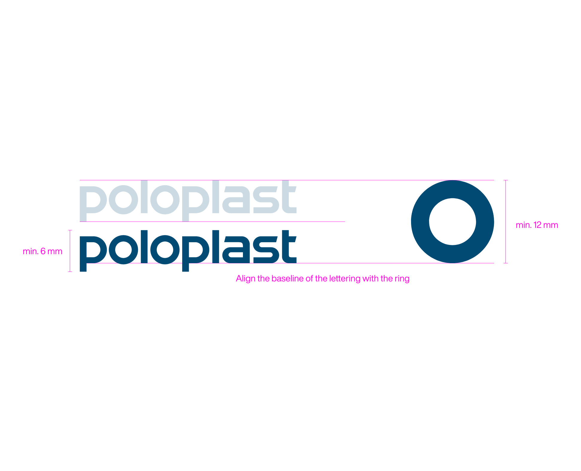 When used in combination with the POLOPLAST logo, the ring must be three times the height of the POLOPLAST wordmark. The ring is aligned with the lower edge of the “P” in the POLOPLAST logo. Placement with a centred or top‑aligned POLOPLAST logo is not permitted.